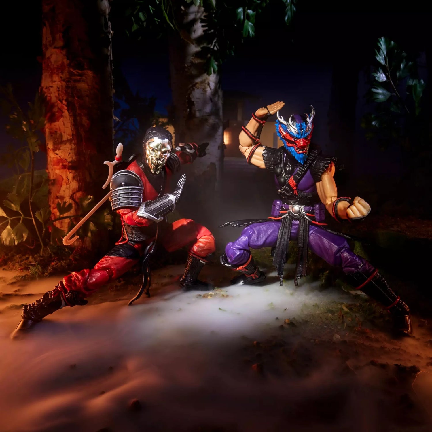 This Cobra Ninjas Slice & Dice figure set contains 24 character-inspired accessory pieces. Slice comes with alternate scorpion-mask head, 4 alternate hands, 2 hook swords, 2 knives, 2 katar, sai, sash with kunai, hat, and removable cape. Dice comes with alternate dragon-mask head, traditional Dice-clan masked head, 4 alternate hands, bladed bo-staff, and 2 battle axes. Cobra Ninja Dice manipulates his bo-staff with blinding speed and bone crushing power employing the “Flying Dragon” technique. Cobra Ninja Slice has mastered the backhand “Scorpion Slash” with his hook swords.