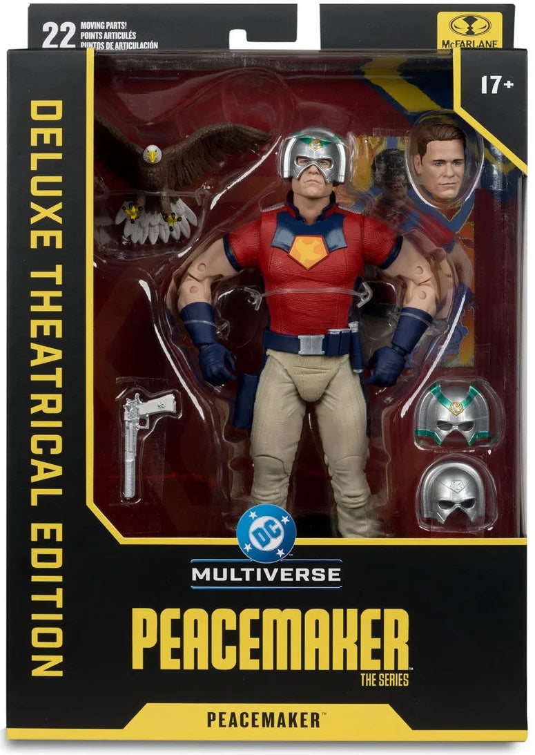 The DC Multiverse Deluxe Theatrical Edition Wave 2 Peacemaker: The Series Peacemaker 7-Inch Scale Action Figure features ultra articulation with up to 22 moving parts for a full range of posing. This figure is based on the HBO Max show Peacemaker: The Series. Peacemaker includes accessories like Peacemaker's "big gun", 3x interchangeable helmets, Eagly, unmasked head portrait and figure display base. Also included is a collectible art card with character artwork on the front, and a character biography on the back. This figure measures approximately 7 1/2-inches tall. Ages 17 and up!