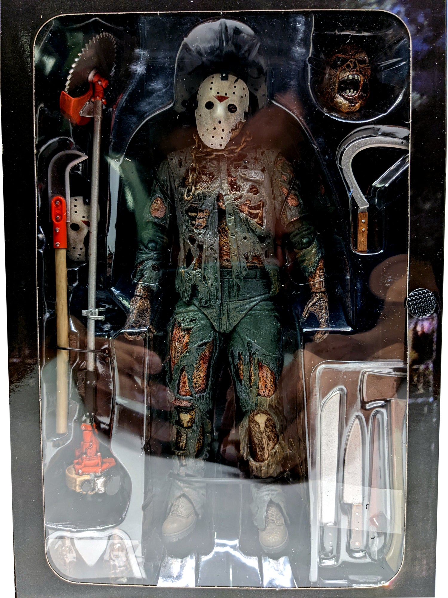 From the Friday the 13th franchise, we are happy to announce the definitive collector’s version of Jason as he appeared in Part 7 will be back in Ultimate form. This articulated 7” scale action figure includes two interchangeable heads and is loaded with accessories. Window box packaging