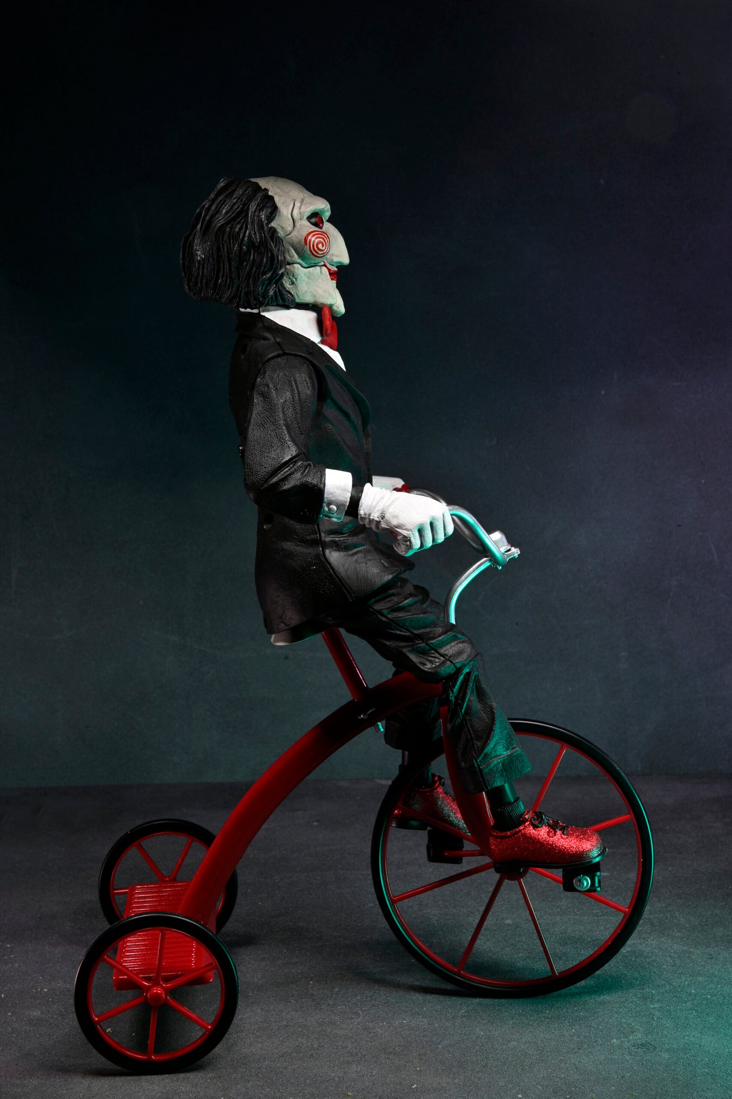 Billy is back! In the Saw movies, The Jigsaw Killer abducts the morally wayward in a twisted attempt to teach his victims the value of life. Once captured, his prisoners must face impossible choices in a horrific game of survival as he communicates with them through an eerie puppet. This 12” action figure of Billy the Puppet on Tricycle features new paint deco and closed box packaging. Press a button to hear sound from the movie! Batteries included.