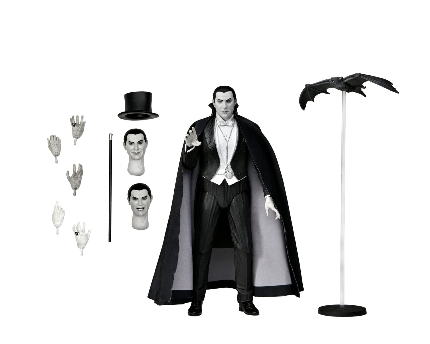 NECA announces a new Ultimate action figure of the most famous vampire of them all… Dracula! Following the color version, we’ve created a special black-and-white figure that features the formal tuxedo seen at his Carfax estate. We worked closely with the estate of Bela Lugosi to capture the actor’s expressive likeness and for additional background detail on important costume elements. Standing in 7” scale, the Ultimate Dracula (Carfax Abbey) action figure has a removable soft goods cape and comes with plenty of accessories: top hat, cane, bat, flight stand, plus three interchangeable heads and hands. Includes additional neck piece making it compatible with the heads from the color version. Display-friendly window box packaging with opening front flap.