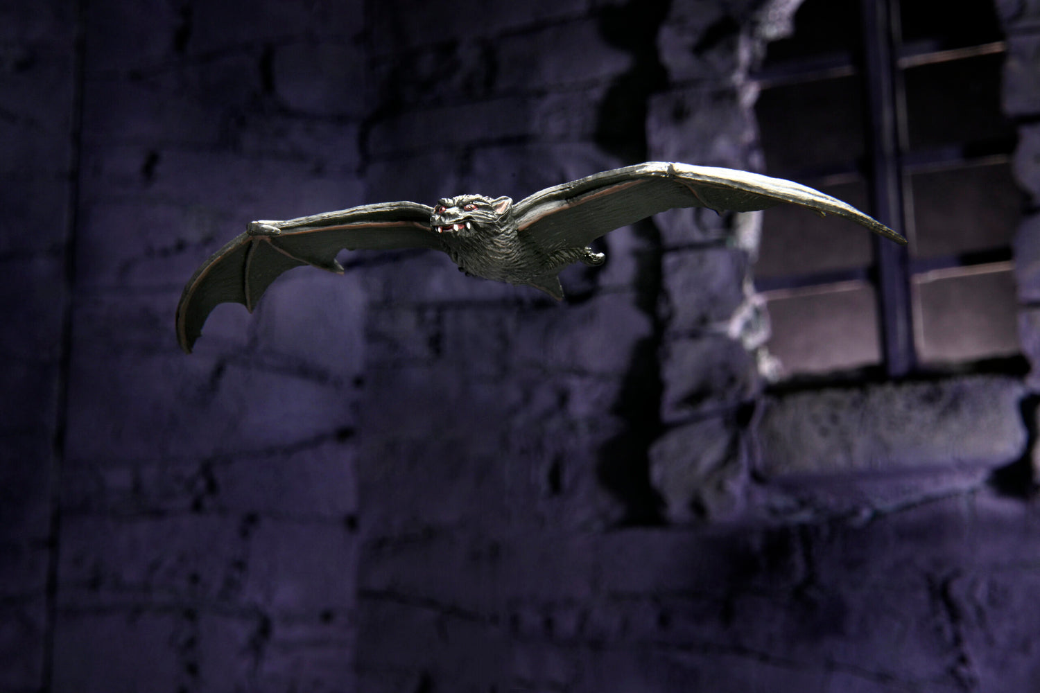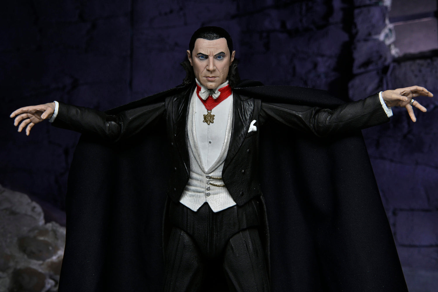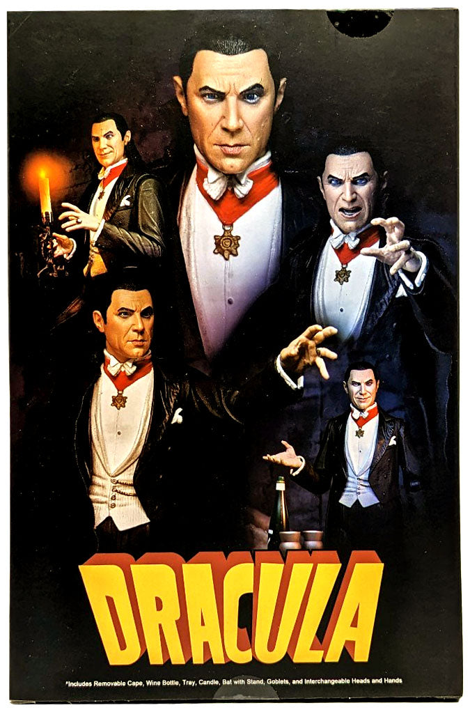 To celebrate the 90th anniversary of Universal Monsters’ acclaimed silver-screen classic, NECA announces an Ultimate action figure of the most famous vampire of them all… Dracula! We worked closely with the estate of Bela Lugosi to capture the actor’s expressive likeness in three different head sculpts, and for additional background detail on important costume elements. Standing in 7” scale, the Ultimate Dracula (Transylvania) action figure has a soft goods cape and comes in premium anniversary packaging with plenty of accessories: 3 interchangeable heads, interchangeable hands, large bat, wine bottle, goblets, candlestick and serving plate.